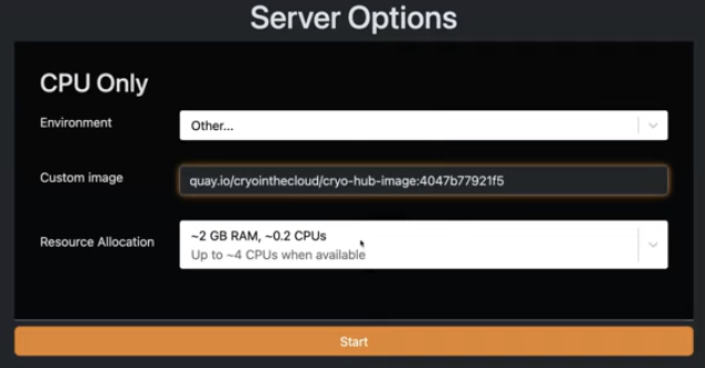 quay.io/cryointhecloud/cryo-hub-image:e457bd429a1ePaste the tag into the Custom image field on CryoCloud. For reference, this image is built from the code in: https://