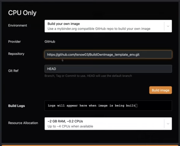 To use a custom Docker image, select Other. A field labeled Custom image will appear. This is where you will paste the Docker tag for the environment you want.