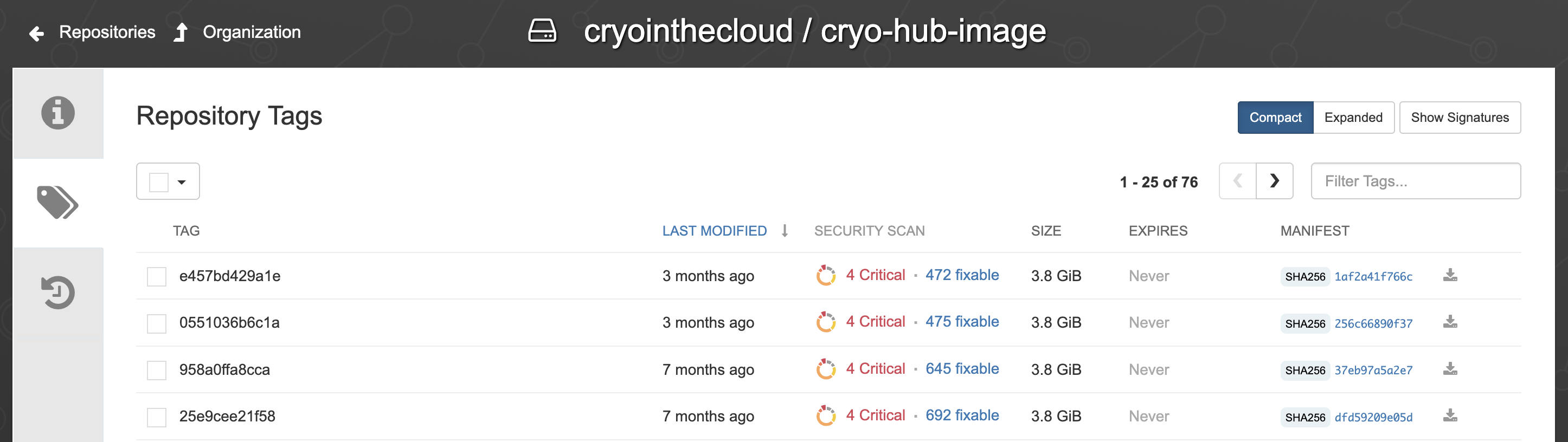 quay .io /repository /cryointhecloud /cryo -hub -image ?tab = tags Browse the available tags. Each tag corresponds to a specific version.