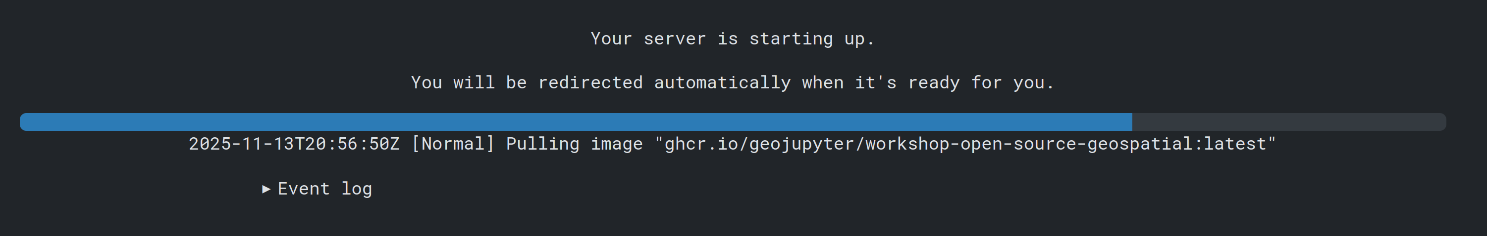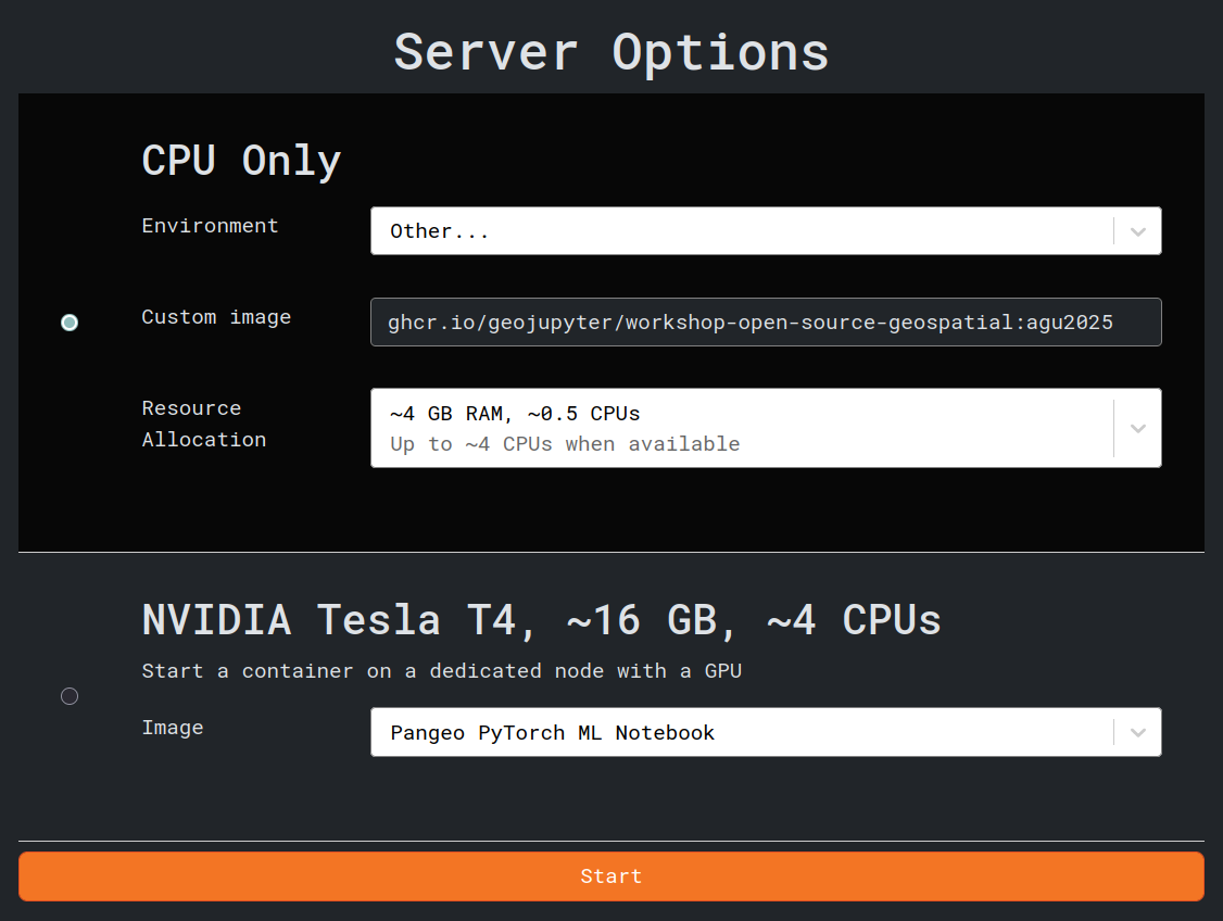 ghcr.io/geojupyter/workshop-open-source-geospatial:agu2025Resource allocation: β~4GB RAM, ~0.5 CPUsβ